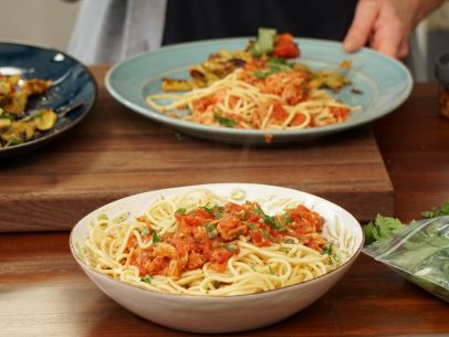Bring a large pot of salted water to a boil. Cook the spaghetti according to the package directions. Reserve 1 cup of the cooking water, then drain the spaghetti in a colander.