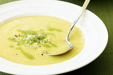 Heat the remaining oil in a large pan over medium heat. Cook onion, celery and garlic for 5 minutes or until soft. Add the kernels and potato, and cook for 1 minute. Add the stock, cobs and 1 litre water. Bring to the boil, then simmer over medium-low heat for 30 minutes or until potato is tender. Discard the cobs and blend soup until smooth. Strain through a fine sieve, season and serve topped with chive oil and extra celery.