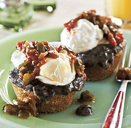 Transfer the muffins to a plate, cut side up. Spread half the beans on top of each muffin; top with a poached egg and the ranchero sauce. Crumble the reserved muffin top over the sauce, and eat.