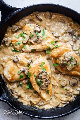 Return chicken and mushrooms to pan and add cream and simmer over low heat 10 minutes.