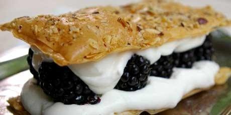 2. Whip the cream with enough sugar to sweeten, and the vanilla. Assemble the dessert just before serving: Lay a phyllo layer on each of four plates. Top each with 1/4 of the cream mixture. Arrange berries stranding upright on top. Top each dessert with another round of phyllo. Serve.
