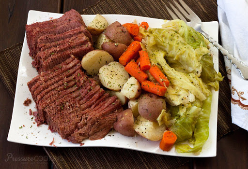 Add the potatoes, carrots and cabbage to the broth in the pressure cooking pot. Lock the lid in place. Select High Pressure and set the timer for 3 minutes. When beep sounds, turn off pressure cooker and do a quick pressure release to release pressure. When valve drops carefully remove lid. (Check the potatoes and if they’re not tender enough, just select sauté cook them until they’re the desired tenderness.)