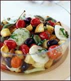 Meanwhile, in a bowl, mix the lemon juice with the remaining 3 tablespoons of olive oil; season with salt and pepper. Add the cucumber, olives, capers, caperberries, basil, tomatoes and bread and toss. Serve at room temperature.