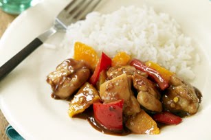 COOK chicken in nonstick skillet on high heat 5 to 6 min. or until done, stirring frequently. Add ginger and garlic; cook and stir on medium-high heat 2 min. Add red peppers; cook 2 min. or until crisp-tender, stirring frequently. Transfer to bowl; cover to keep warm.