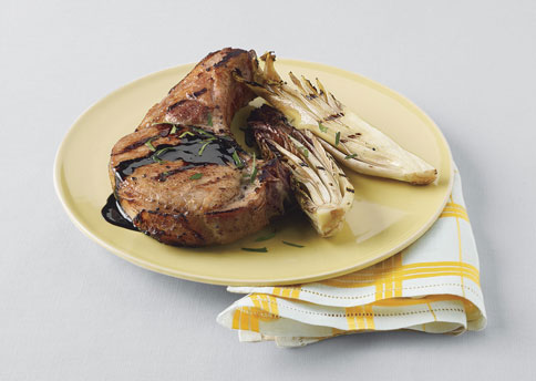 3. Remove pork from brine; pat dry. Brush with oil; sprinkle with pepper. Grill pork, Treviso, and endive until vegetables are softened and thermometer inserted horizontally into center of chops registers 150°F, 2 to 3 minutes per side for vegetables and 7 to 8 minutes per side for chops.