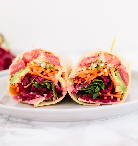 1.Lay out a wrap on a clean, level surface (like a cutting board or on a plate.) Spread out an even layer of hummus. Top with avocado and tomato slices. Then, add the spinach, sprouts, and spiralized cucumbers, carrots, and beets. Carefully wrap the wrap like a burrito, first closing in the sides and the rolling tightly. Secure both ends with toothpicks and then slice in half. Repeat until all vegetables are used (my vegetables yielded about 3-4 wraps.)