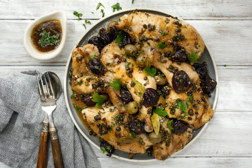 Transfer the chicken pieces to a warm serving platter and top with the prunes, olives and capers; keep warm. Place the roasting pan over medium heat and bring the pan juices to a boil. Reduce to about 1/2 cup. Strain into a heatproof bowl, add the parsley and pour over the chicken.
