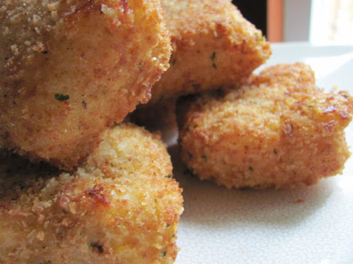 Using a pastry wheel or a sharp knife, cut the mixture into 2-inch squares and transfer them to a sheet of waxed paper. Dredge each square into the remaining flour and coat completely. Shake off excess flour and dip into the egg wash, followed by the bread crumbs. Pat the square gently with a spatula to help the crumbs adhere. Repeat with all the squares and place them on a baking sheet. Refrigerate for at least 1 hour, until the coating is firm.