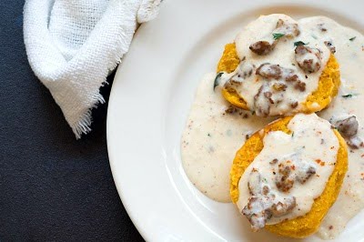 To assemble the biscuits and gravy, slice each biscuit in half and drizzle with gravy.