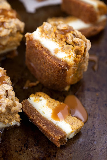 Delicious pumpkin cheesecake bars — two layers of cheesecake on a delicious cinnamon graham cracker crust all topped with an easy streusel and caramel sauce.