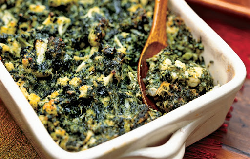 Don't think caramel custard dessert—think super tasty cauliflower and broccoli smothered in spinach and cheese cream sauce.