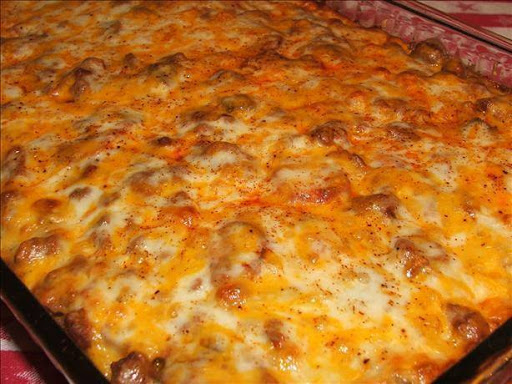 Spread meat mixture over spaghetti.