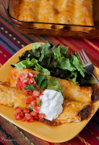 Fill each tortilla with 1/3 cup of the shredded beef mixture and 1 tablespoon cheese. Roll up and place seam side down in the pan.