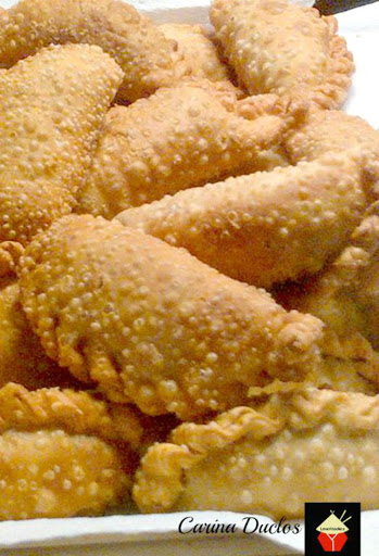 5. Make sure the oil has reached the temperature of 400 F. If the oil is not hot enough, the empanadas will not be nice and crispy. Then carefully place the empanadas in the oil, and cook for around 5 - 7 minutes, until golden and the pastry goes bubbly like in the photo. Do not over fill the pan, but cook in batches so everything can cook evenly.