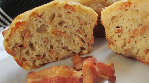 Beat eggs, milk, and vegetable oil together in a small bowl; stir into flour mixture just until moistened. Gently fold bacon through the batter. Spoon batter into prepared muffin cups.