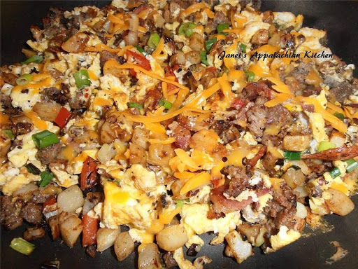 In a large skillet, fry up the bacon until crispy, remove to a paper towel lined plate and roughly chop when cooled. Add the sausage to the same skillet and brown it, breaking it up with a wooden spoon as it cooks. Remove the sausage to drain on a paper towel. Add the frozen hash browns and 1 T. of butter to the skillet. Cook over med. high heat till they are tender and begin to brown. Add the bell pepper and cook for 2-3 minutes to soften then add the green onions, drained sausage and chopped bacon, stirring to combine. Push the potato mixture to one side of the pan and add the remaining butter to the other side and pour in the beaten eggs. Stir the eggs till they just begin to set and then fold the potato mixture into the scrambled eggs, combining well. Stir in the 3/4 of the cheese till melted and season with salt and pepper to taste. Top with the remaining cheese just before serving.