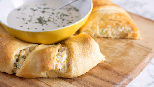 Open the packages of crescent rolls and lay the long end out in a ring, overlapping them to form the base. The center circle should be about 5 inches in diameter.