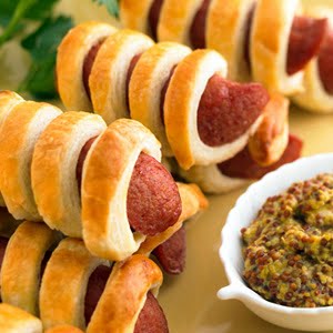 Wrap 1 frankfurter in each pastry rectangle, covering completely. (Updated version has pastry cut into strips and wrapped around franks).