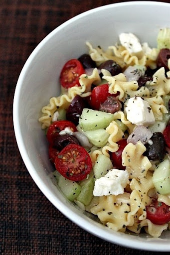 Pasta salad that's gone Greek! Feta cheese, red onions, cucumbers, olives and tomatoes are added to pasta with a Greek dressing to make this Greek Pasta Salad.