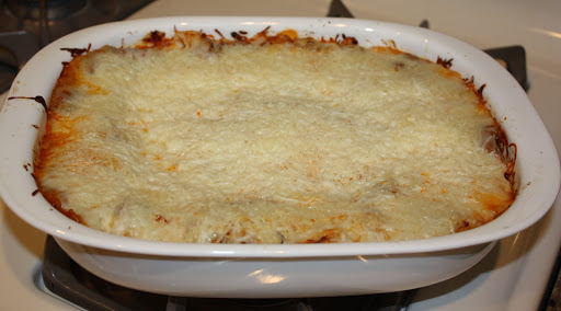 Next add a layer of meat mixture; Repeat layers again beginning with a layer of noodles.