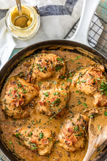 7.Whisk in the remaining dijon, the whole grain mustard, and the heavy cream. Add back in the chicken, bacon and toss in the fresh thyme.