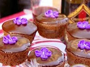Dip the top of each cupcake in the ganache. Decorate with candied violets, if desired. Do not refrigerate.