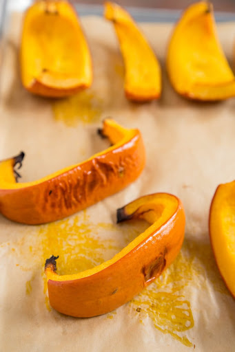 7. Roast the pumpkin: Roast for about 35 to 40 minutes, until fork-tender.