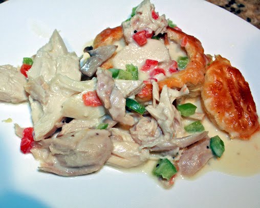 Melt butter or margarine and blend in flour, salt and pepper. Cook over low heat until bubbly. Remove from heat and add chicken broth and milk or cream. For richer flavor use cream. Cook until as thick as you want; stir in cooked chicken gently and remaining ingredients. Keep hot in slow-cooker. Serve over biscuits, toast points or hot cooked pastry shells.