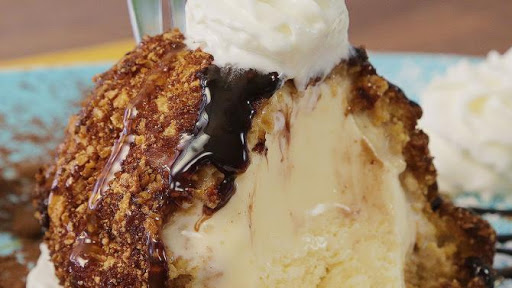 5) Heat about 3 inches of oil in a small pot to 400 degrees. Remove ice cream from freezer and fry immediately, dipping it into the oil for about 30 seconds or until golden brown.