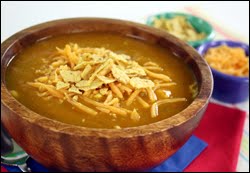 Stir in enchilada sauce and pumpkin. Once soup returns to a low boil, add chicken and corn, and mix well. Cook for an additional 3 - 5 minutes, until soup is heated throughout.