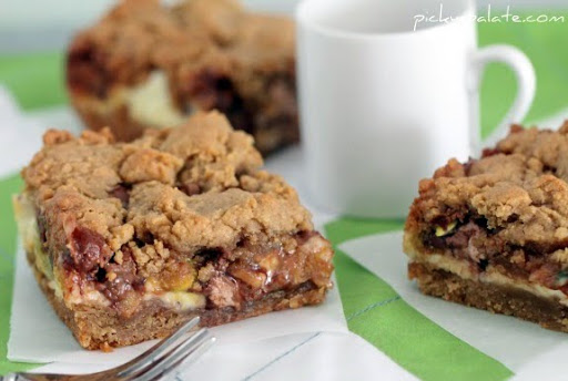 3. In another bowl mix the softened cream cheese and sugar until smooth then layer over peanut butter dough. Cut up chocolates and layer over cream cheese then top with remaining peanut butter cookie dough. Bake for 25-30 minutes or until cookie turns golden brown. Remove and let cool completely then cut into squares.