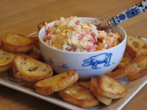 I’d like to say right up front that I love pimento cheese. Although I was born in New Jersey (if Princeton counts as New Jersey) I think I’ve always loved the quintessentially southern treat since I first encountered it on rubbery store-bought white bread made into crustless sandwiches when I was a little girl transplanted to Virginia. In the old days, one used to be able to buy “good” pimento cheese at the grocery store, which, I’m very sad to say, is no longer the case. I’ve made it a little game to look at the ingredients on containers of pimento cheese I’ve stumbled upon in recent years, and, frankly, have been horrified with some of the completely unacceptable things I’ve found listed. Believe me, cream cheese has no place in real pimento cheese.