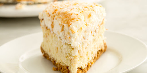 When ready to serve, make frosting: Beat cream cheese, butter, and coconut milk until combined. Slowly add powdered sugar and toasted coconut until creamy. Frost cheesecake and top all over with toasted coconut.