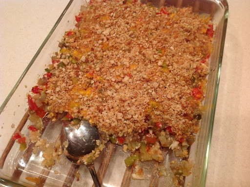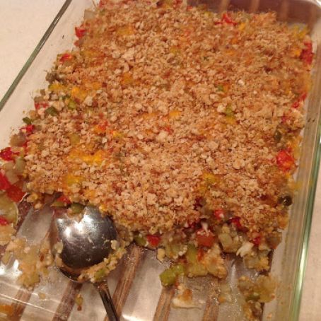 I doubled the recipe and put it in a buttered 9 x 13 glass baking dish. I used cauliflower rice in place of regular rice. I was very generous with the cauliflower and used closer to 2 cups rather than one. I also chopped up a whole green pepper which was closer to a cup rather than 1/2 cup. Next time I would use more cheese. I had some dried breadcrumbs that I sprinkled over-the-top. I did not bother adding additional butter. The breadcrumbs could be omitted easily. I baked the mixture for 30 minutes and then added the cheese and breadcrumbs and baked for 10 more minutes.