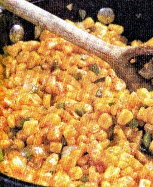 Add corn and yellow onion, cooking until corn is golden and beginning to brown.