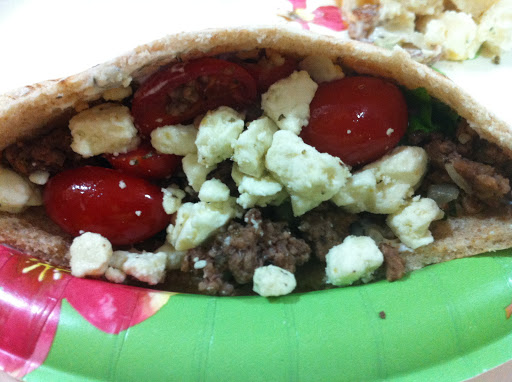 Cut pocket breads in half, then spoon meat mixture into each bread pocket and top with Yogurt Dill Sauce. Sprinkle sparingly with feta cheese.