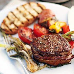 These bacon-wrapped steaks are cooked on a cast-iron griddle over a backyard grill.