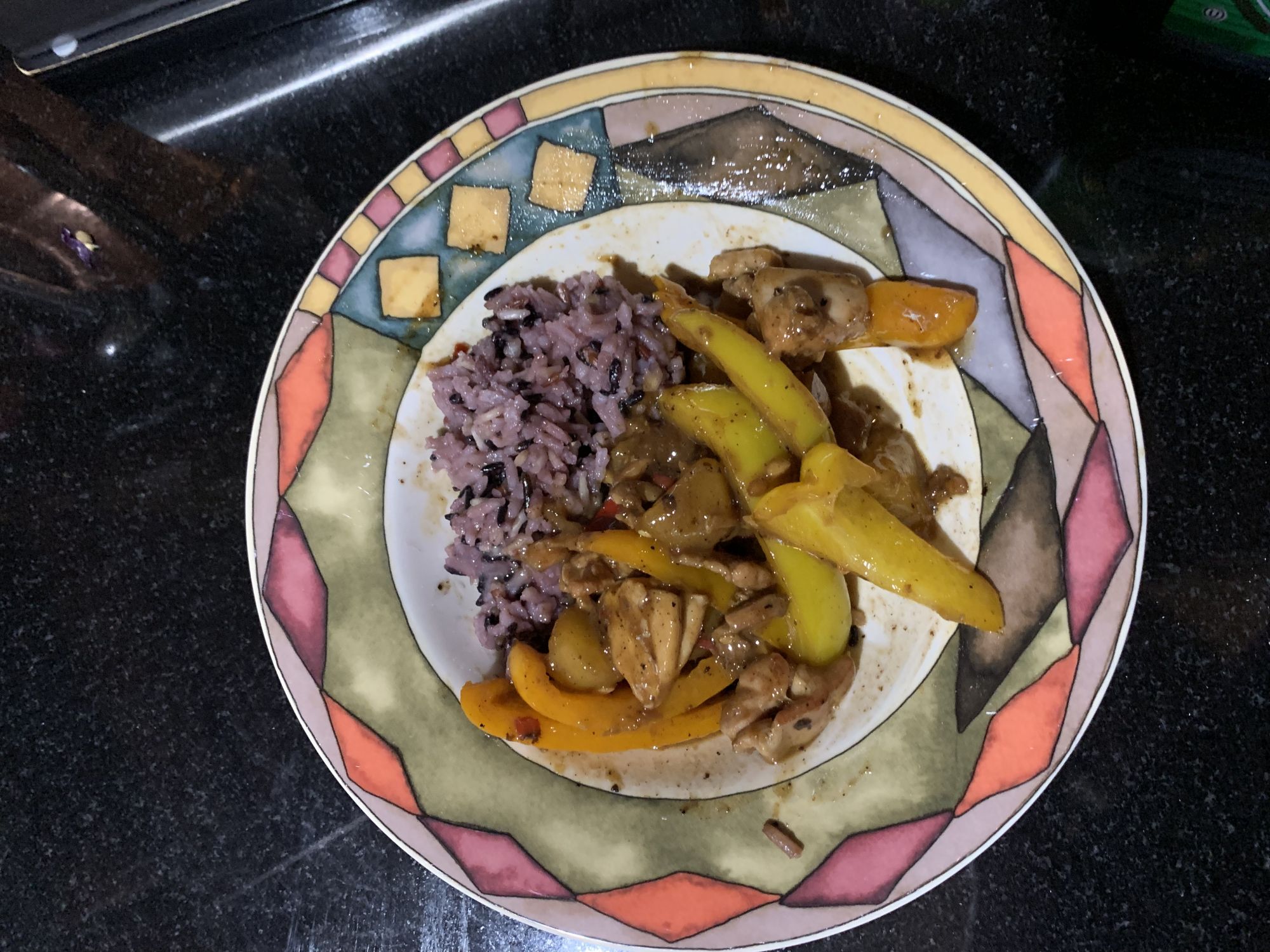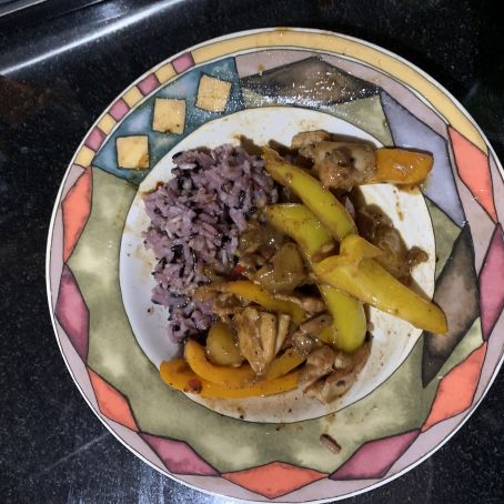 Sweet spicy salty stir fry chicken with Mango and colored bell pepper serve with rice (white or white/wild/black combo)
