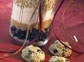 2. Layer the ingredients in a 1-quart glass canister or jar in the following order (from bottom to top): granulated sugar, 1 cup chocolate chips, brown sugar, flour mixture, oats and peanut butter chips. Tap jar gently on the counter to settle each layer before adding the next one.