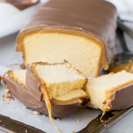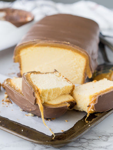 2.Melt the caramel and evaporated milk in a double boiler, stirring until soft and smooth. Remove bowl from heat and let cool completely. Spread/pour the caramel over the pound cake, try to not let it drizzle over the sides. Chill in fridge for at least 10 to 15 minutes.