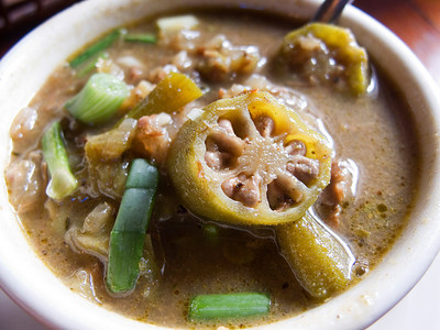 A couple of alternate versions: Some people really don't like okra. I feel sorry for these people. You can convert this from an okra gumbo into a filé gumbo by omitting the okra, and when the gumbo's finished turning off the head, sprinkling 1 to 2 teaspoons of filé powder over the surface of the gumbo. Cover and let stand for 15 minutes, then stir the filé powder into the gumbo. Once this has been done, any leftover gumbo may only be gently reheated; if this is brought to a boil again, the filé will turn stringy and have an unpleasant consistency.