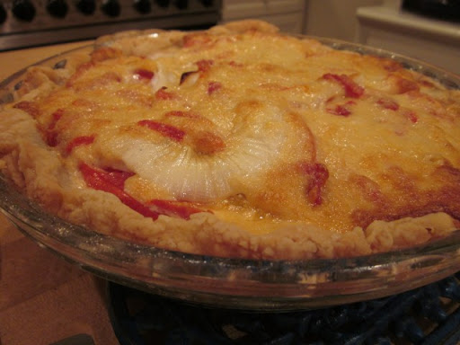 Next I covered the bottom of the pie shell with a layer of the drained, sliced tomatoes and then a layer of thinly sliced Vidalia onion. On top of that I blobbed several tablespoons full of pimento cheese and then made the layers all over again, ending with pimento cheese.