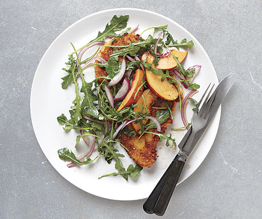 Add the arugula and onion to the peaches and toss well. Serve the chicken topped with the salad.