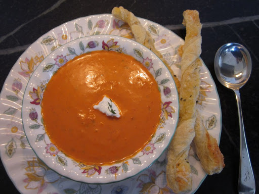 Saturday was spent busily preparing a meal for special guests who’d purchased dinner at Chez Schapiro at the Cystic Fibrosis benefit. I was eager that it be something really special, so, along with good old tried and true recipes, I decided to try something new that had been speaking to me during recent restaurant visits all over town. I first had a very good red pepper and crab soup at Portico, followed by a superlative one at Bacchus on Main. It kept reverberating through my days, and I couldn’t look at a red pepper in the grocery, let alone see that ravishing orangey red color, even on a pillow, without thinking about the soup.