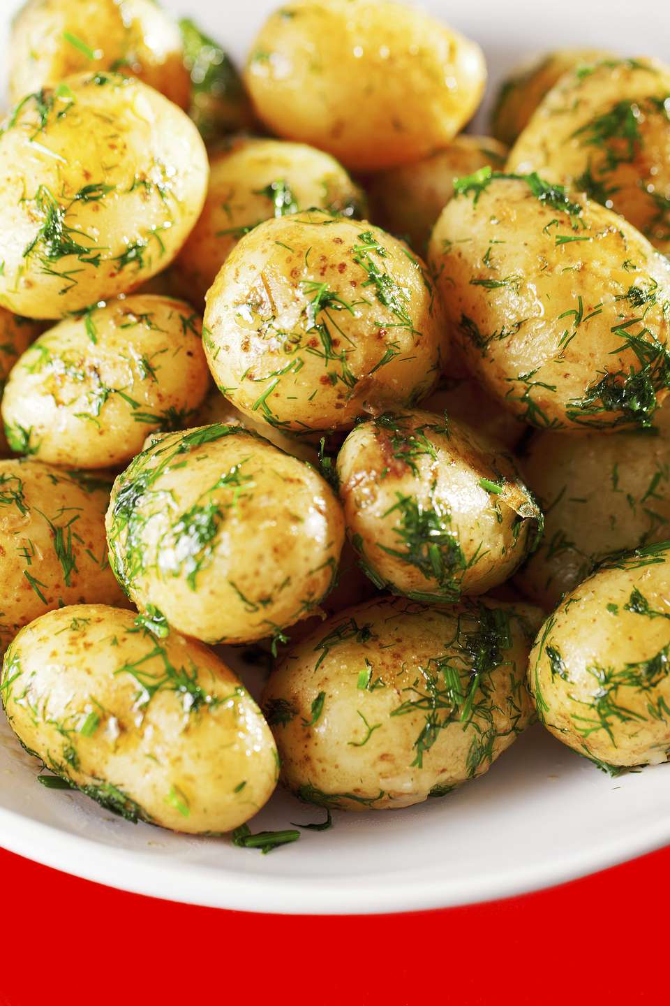 Mix together olive oil, minced garlic, chopped dill, melted butter, salt, and black pepper in a small bowl. Pour over potatoes, seal the container, and let marinate for 30 minutes.