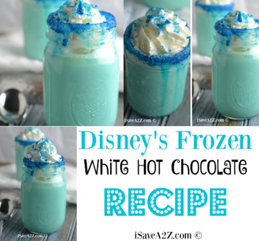 In a small bowl add 1/4 cup sugar and 2-3 blue food coloring drops mix. Place rims of glasses in the sugar. Pour hot chocolate into the cups. Top with cool whip if desired. This really is the BEST White Hot Chocolate recipe on the planet!