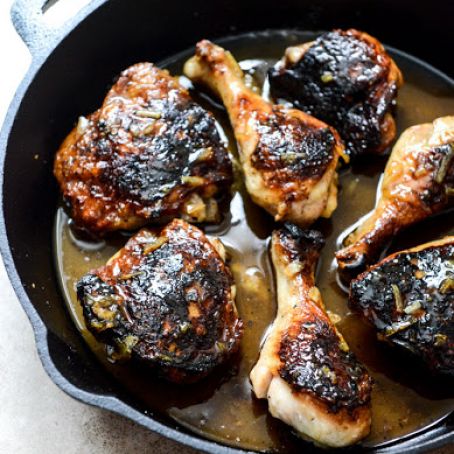 Place the chicken in the oven uncovered and bake for 20 minutes. Every 5 minutes, baste the chicken with the glaze in the bottom of the pan. Serve with greens.