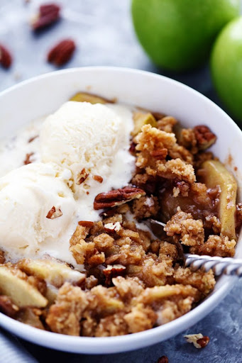 Apple Pecan Crisp is so easy to make and the perfect fall dessert! Crisp and tender apples with crunchy pecans hidden throughout and a buttery cinnamon sugar crumb topping!