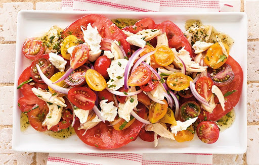 Slice tomatoes and arrange on a platter. Arrange chicken overtop, tucking into tomato slices if you wish. Drizzle with half the dressing. Cut any large cherry tomatoes in half. Place in a bowl, along with cheese, basil and onion. Gently toss with remaining dressing. Spoon over chicken. Excellent with crusty bread.