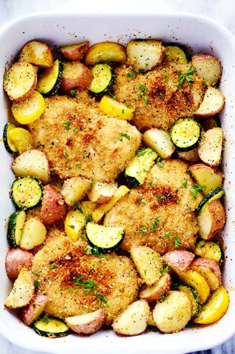 In a medium sized bowl add zucchini, yellow squash, and potatoes. Toss in the olive oil. Add some salt and pepper and remaining parmesan garlic bread coating. Lay on the sides of chicken in the pan.